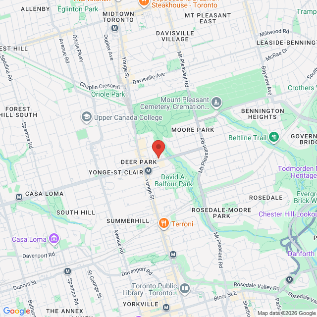 Close to St. Clair/ Young intersection and 2-5 minutes walk from St. Clair TTC subway station. Parking is available free in the neighborhood for an hour and in Green P for longer.